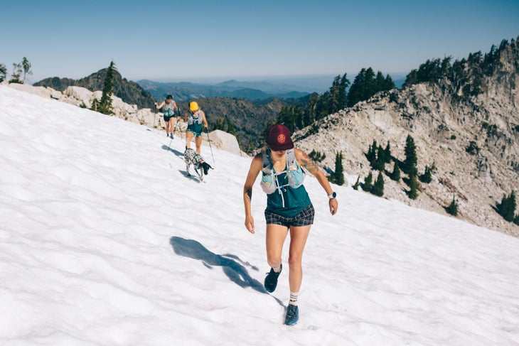 Gear: If you’re looking to duplicate our journey, I’d suggest a kit with gaiters, poles, and if it’s early season or you’re uncomfortable on snow, some microspikes. We didn’t have much trouble finding water– a 1.5L running vest was more than sufficient. We did bring packabe bowls and cool vests for the dogs, made by Ruffwear. These came in handy in the warm summer afternoon.