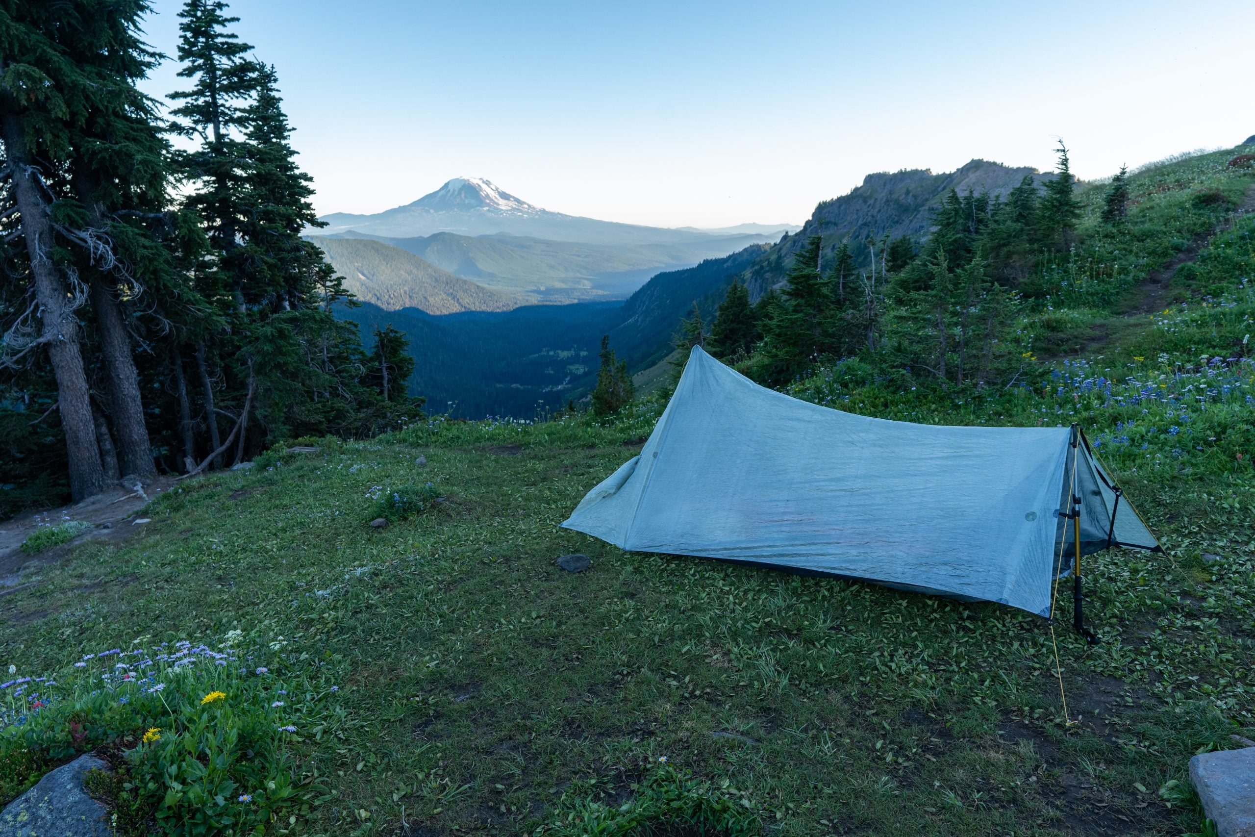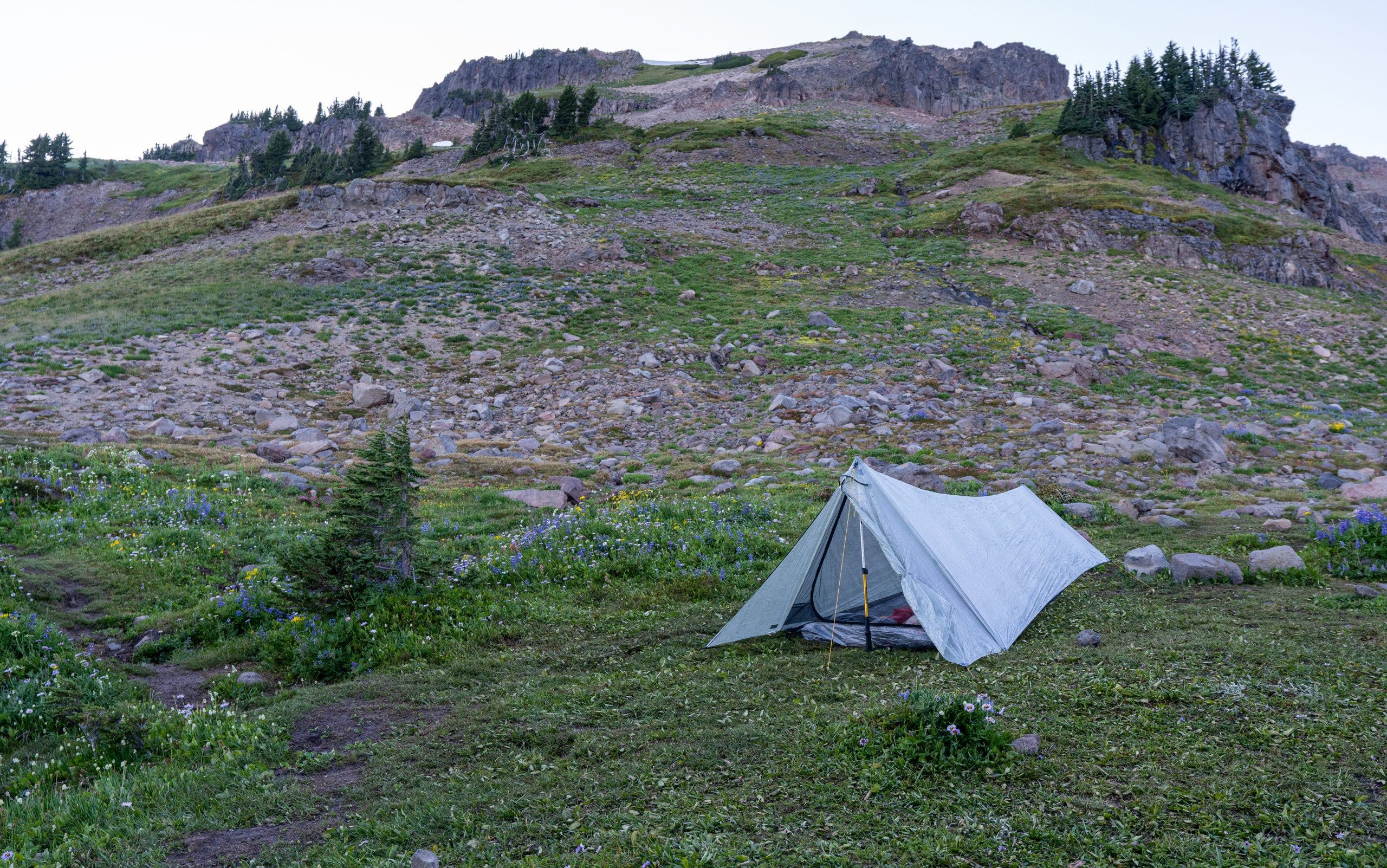 The trickiest aspect of using this Dyneema shelter is managing moisture and coping with strong wind. During one rainy night in the North Cascades, I zipped up the front flaps, closed the back flaps, fell asleep, and then woke up the next morning slightly wet – this is more on me than an indicator of faulty design, but it’s worth keeping in mind that there needs to be an active approach to providing ventilation in this single wall tent or wetness will ensue (condensation, evaporation, and respiration are not a single wall tent’s friends if not accounted for). The tent’s bomber design has no problem managing 30mph wind gusts, as it did during a night in the Goat Rocks Wilderness. However, the taut Dyneema walls created a formidable cacophany of sound during the night. Without earplugs, the noise would make sleeping pretty much impossible. So, I’d recommend finding a sheltered-from-the-wind spot for the ProTrail Li on those blustery alpine nights, or bring some serious ear plugs.