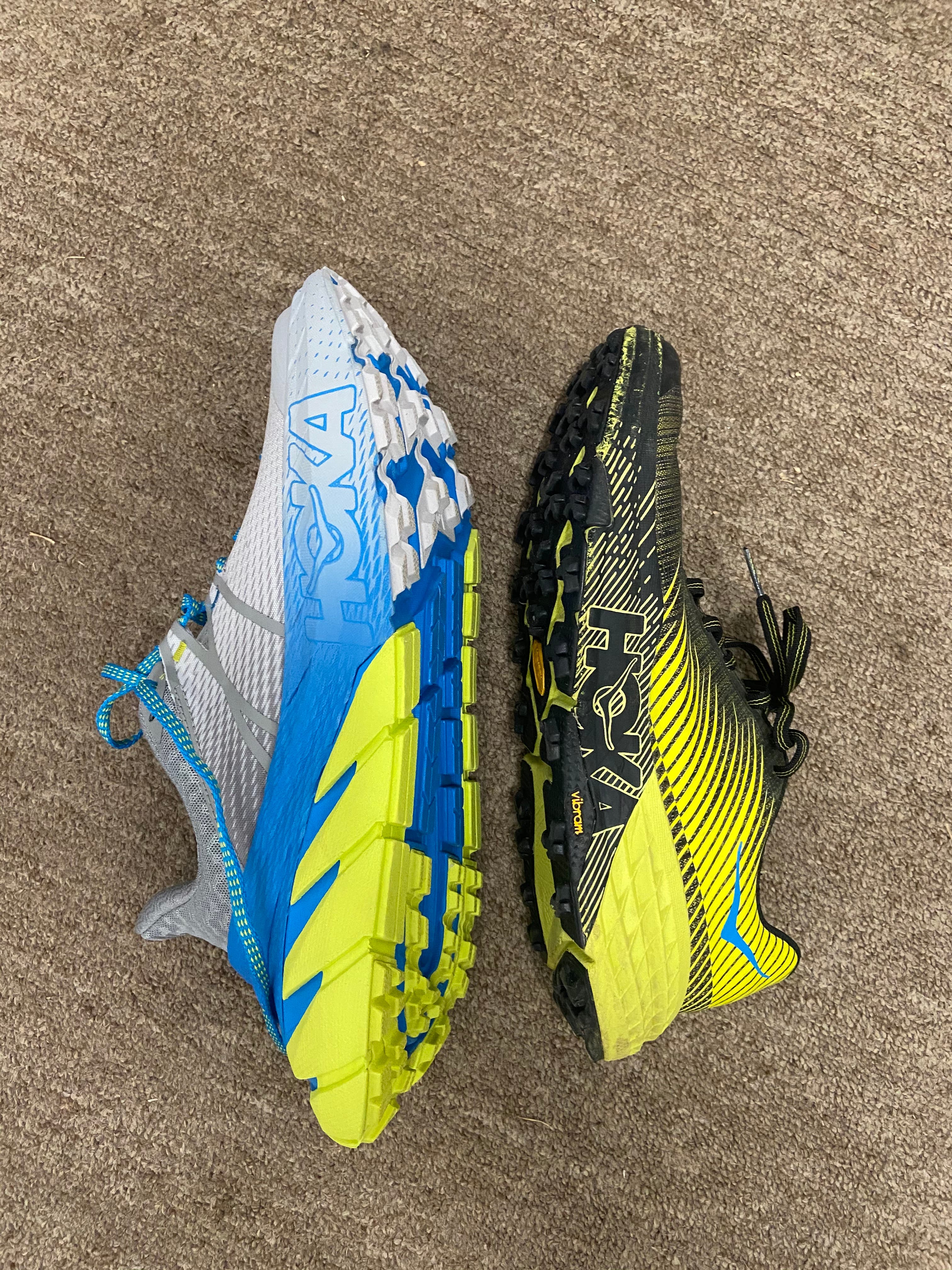 The EVA foam sole will feel familiar to those familiar with Hoka’s squishy family of trail shoes. Instead of a rock plate for protection, the pontoon-like foam is thick enough to allow you to simply roll, monster truck style over any obstacles in the trail. Medium-depth lugs at the heel of the shoe let you pick up speed on the downhills without careening out of control, while a stiffer forefoot and slightly more aggressive lugs at the front provide traction in mud or gravel. The width underfoot didn’t lend as much control as I would have liked on the flats and uphills, and the “maximal ground contact” sacrifices a lot in terms of nimbleness.
