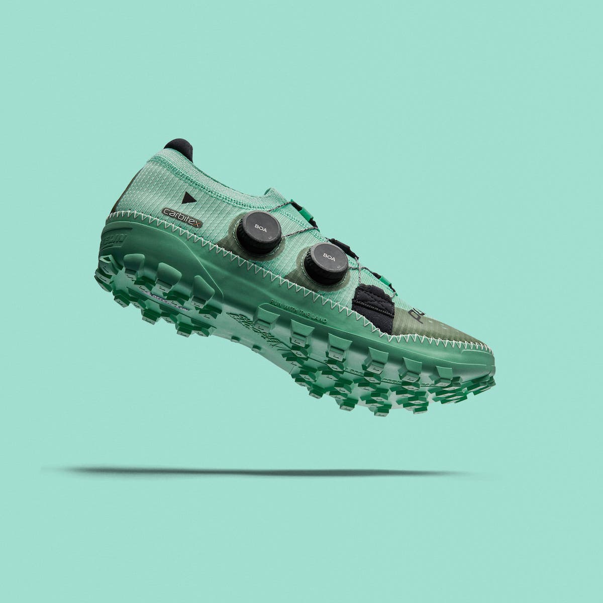 The SL:PDX, which is named in honor of the trails near their Portland, Ore., design lab, has a removable Carbitex carbon-fiber plate with an asymmetrical flex that’s stiff in one direction, but flexible in the other, offering what Dombrow says is “the perfect balance of responsiveness and energy return.” The shoe features two BOA Li2 dial closures connected to support straps integrated to a Dyneema knit upper and a removable Pebax foam midsole. Perhaps most interesting, the SL:PDX also features a Michelin rubber outsole with lugs that can be — and are meant to be — permanently trimmed to match the regional terrain.