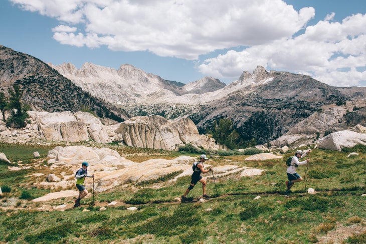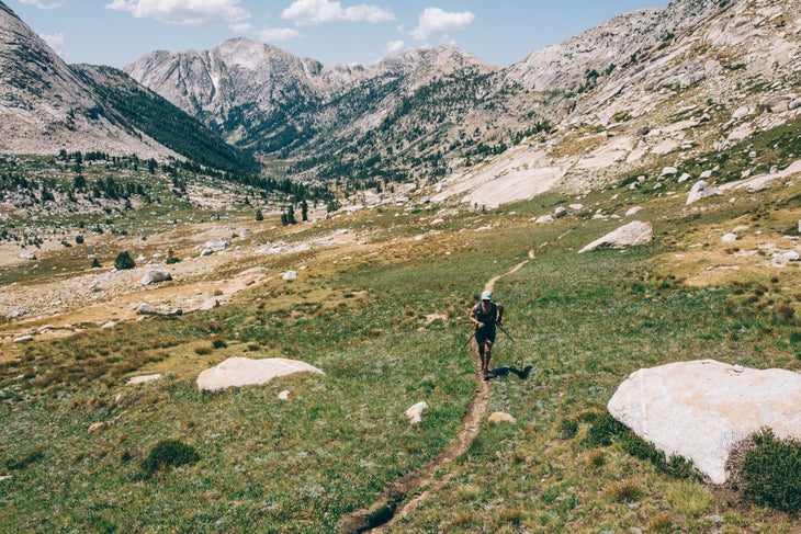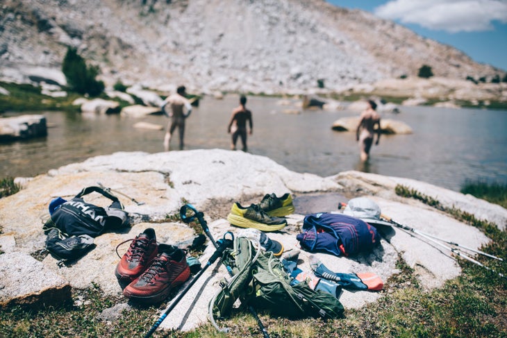 Gear: We tackled this run in late July on a historically low snow year and still found plenty of water. There are a number of alpine lakes to refill at (and swim in) and quite a few rivers and streams as well. I’d still suggest bringing a vest with a water bladder, as there are a couple long and exposed climbs that might be hard with just a handheld. We also found poles to come in handy–the Sierra has very little understory so they are pretty easy to use on this run.