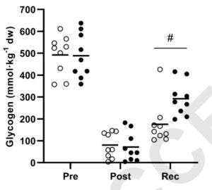 Here’s what the muscle biopsies revealed about the amount of carbohydrate stored in the subjects’ thigh muscles before the interval workout (Pre), after the interval workout (Post), and after five hours of recovery, right before the all-out sprints (Rec). Open circles are the placebo group, filled circles are the high-carb group: