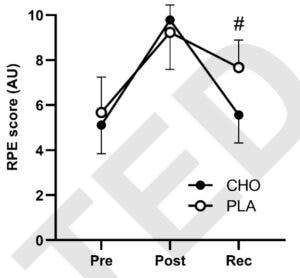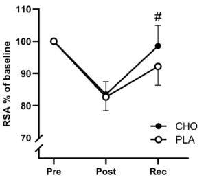 Here’s how the all-out sprints went for the high-carb (CHO) and placebo (PLA) groups, expressed as a percentage of their baseline repeated sprint ability (RSA):