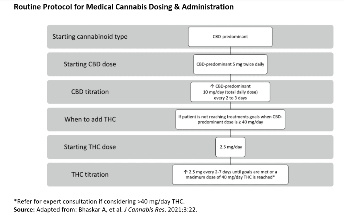 Start with 5 mg CBD twice daily, titrating by 10 mg every 2 to 3 days until the patient reaches their desired outcome, or up to 40 mg/day. If relief is not found at 40 mg/day, consider adding THC.