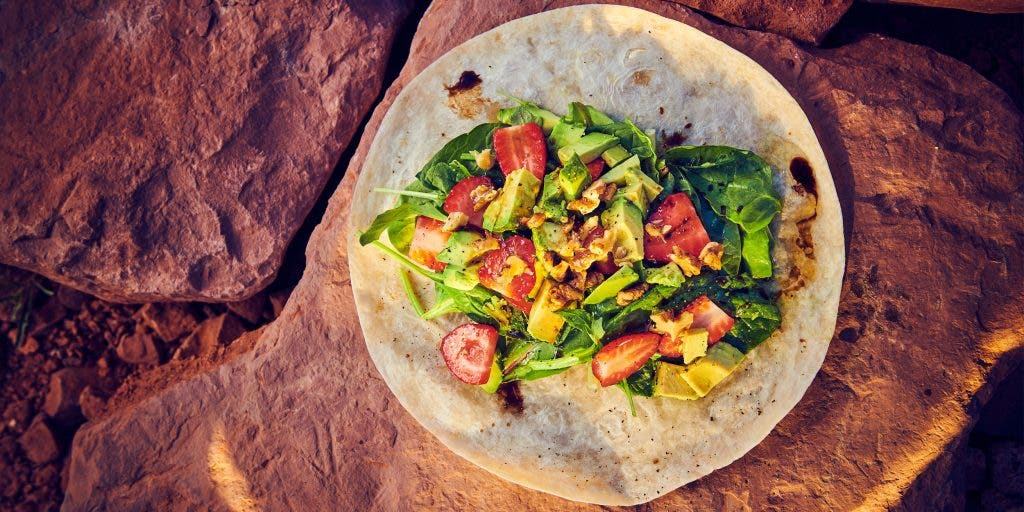 With limited supplies and a stash of fruit ripening too quickly under the hot desert sun, I rolled up sliced strawberries and avocado in a tortilla for a quick breakfast before running around the canyon. With a few tweaks, this makes for a delicious and refreshing meal anytime of the day.