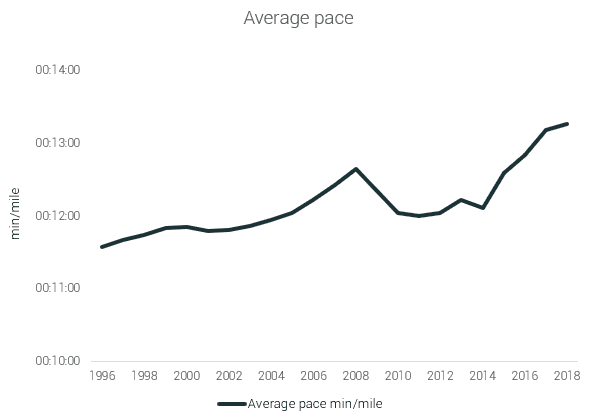 That said, those who race longer distances—think 100ks and 100-milers—tick off faster paces than their peers in shorter races. The pace of 100-mile runners has actually improved in 23 years, from 9:58 to 9:46 minutes per mile.