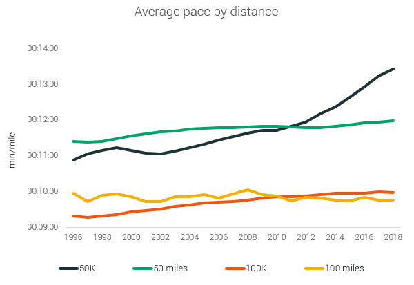As more people have entered the sport, the average times have slowed across all distances, age groups, and genders of participants. For all ultra events, the average pace is 13:16 minute per mile—a 1:41 minute per mile addition to the pace in 1996. Interestingly, all age groups hit similar paces, something not common in other distances.