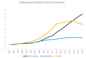 Looking at another dataset of endurance runners, Strava’s 2019 Year in Sport report is based on data from 48 million users in 195 countries. It showed an 8.8 percent year-over-year increase in U.S. users who recorded a marathon or ultra from 2018 to 2019. For context, 7.6 percent of U.S. runners on the social network have recorded a ‘thon or ultra, and Strava confirmed that three percent of its U.S. runners recorded at least one ultra.