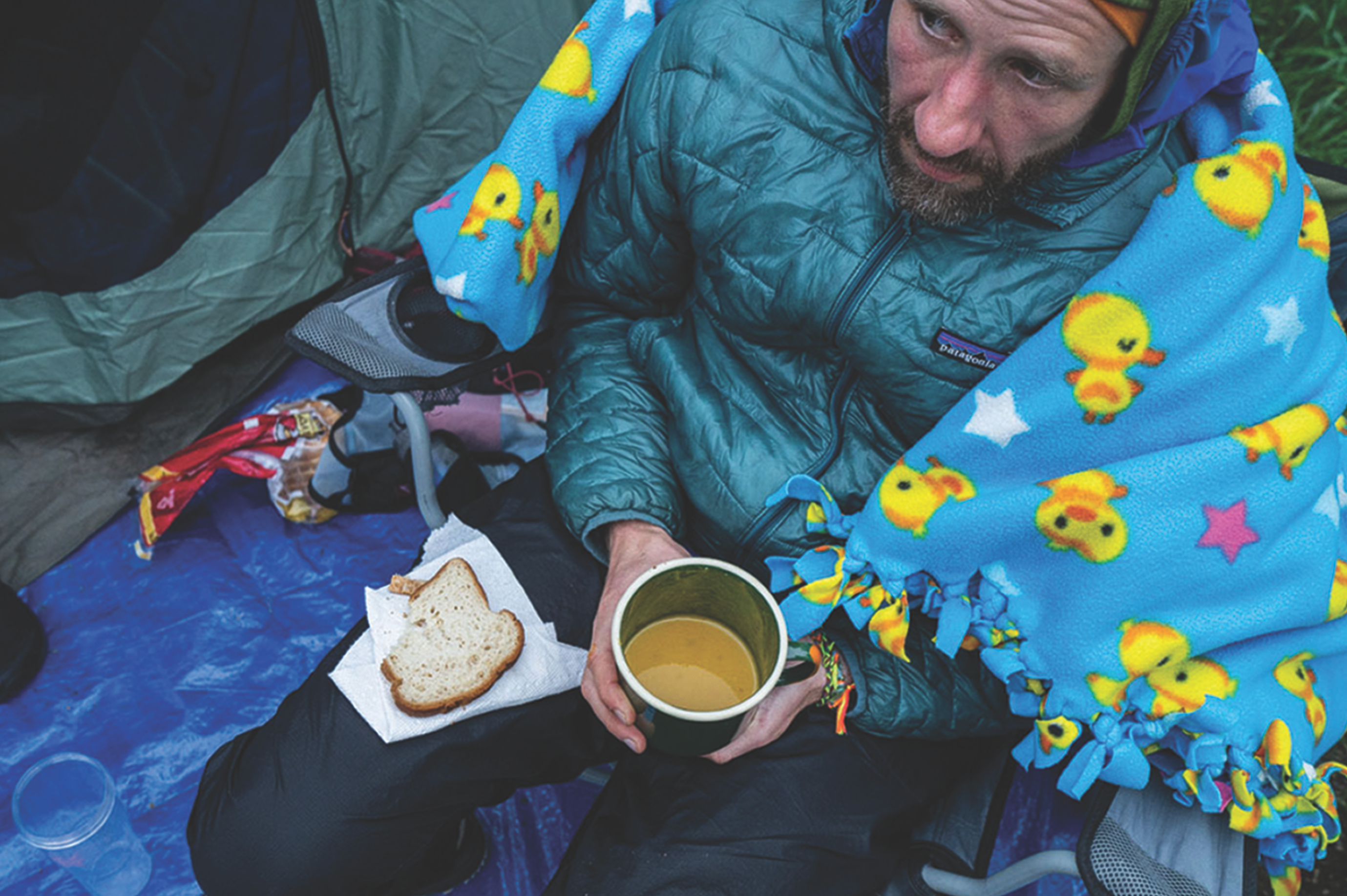 The next aid station was a welcome respite, with 70 miles and 12K vert on my legs. I hadn’t been able to keep food down for 35 miles and was shivering from being rained and dripped on for the past eight hours. As I sat in a chair with a rubber- ducky blanket wrapped around me, Kyle handed me a piece of gluten-free bread and a cup of broth, coaxing me to down both like a child. “Here comes the choo-choo train,” Kyle e jeered, while the adults all around cheered for every bite.