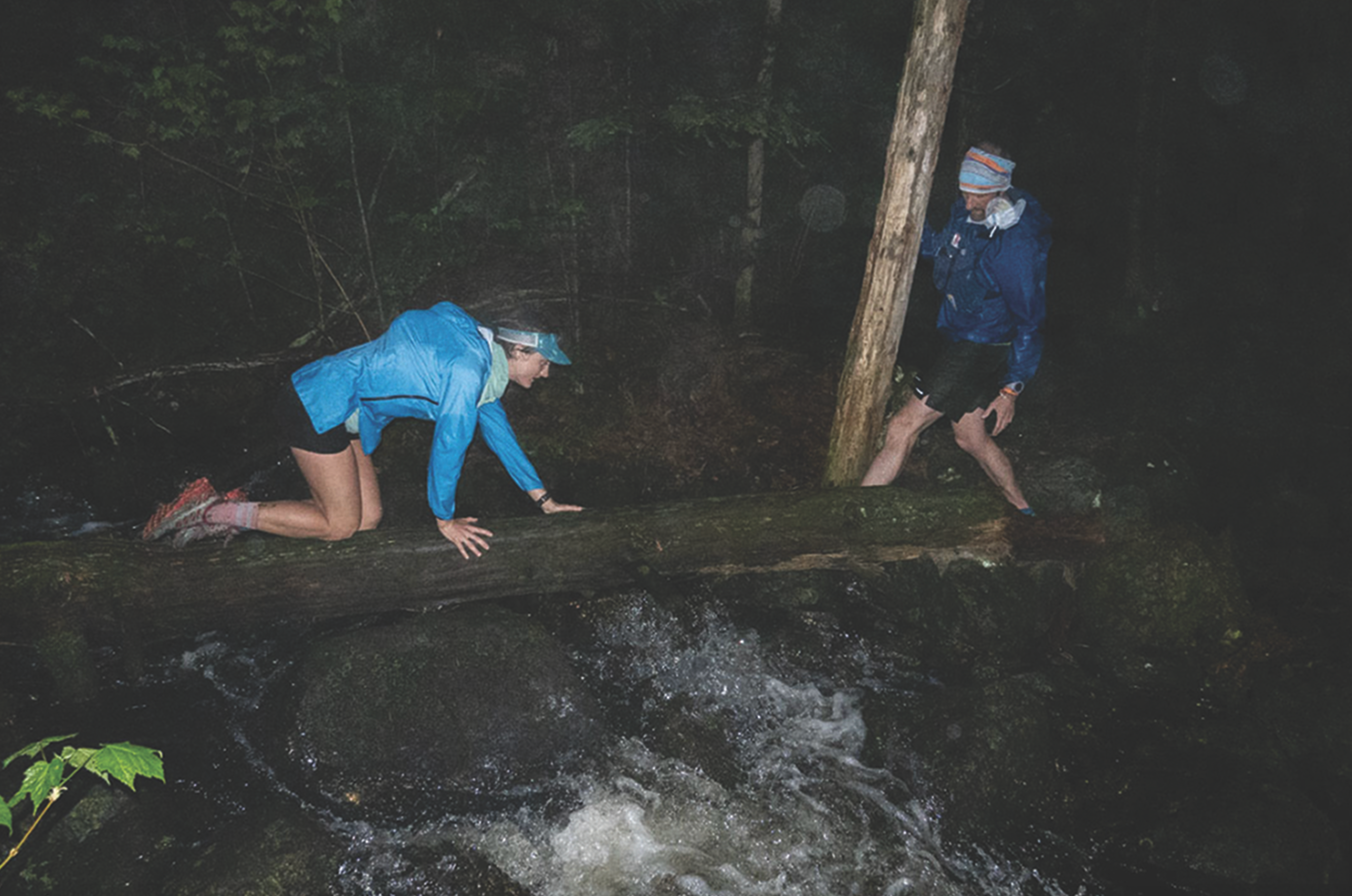 About 15 minutes after I left the aid station, the temps dropped to the low 40s, and the sky opened up and poured on us with lightning all around. It was a fast-moving storm cell, and we could see light behind it on the horizon. Though it rained for only an hour, the foliage was now drenched and kept us soaked through the rest of the night. Hypothermia was a worry, but we kept moving and stayed warm enough. After a couple of water stops and river crossings via logs, we made it to the end of this segment where Erica was waiting at the first road crossing in 40 miles with a warm car and dry clothes. Peyton and I tackled the rest of the BRT together through the night hours, coming to the BRT’s western trailhead just as it was getting light.