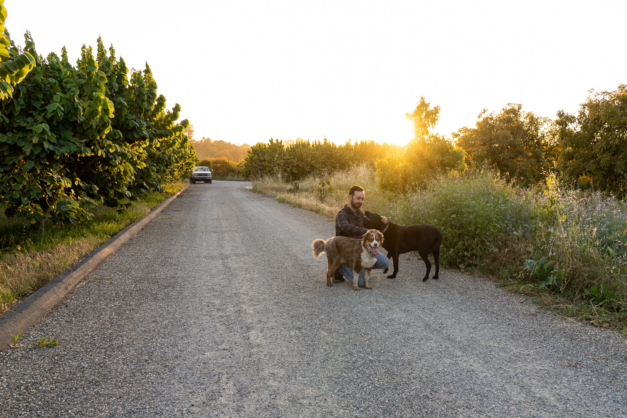 The next morning, I woke up and put on my running shoes to explore a bit. Row after row of handsomely round trees tumbled past my eyes as I darted in and out of the geometry of it all. One row of cherimoya towering overhead looked like the next. Shorter rows of trellised passion fruit gave me visibility to rows of avocado trees. The orchard rolled in waves, the smells, sounds of buzzing bees, and glaring botanical beauty almost too much to bear. I was completely alone being swallowed up by an orchard. As I wandered back to the farm house, Nick’s dog, Levi, dropped an avocado at my feet for me to throw for him.