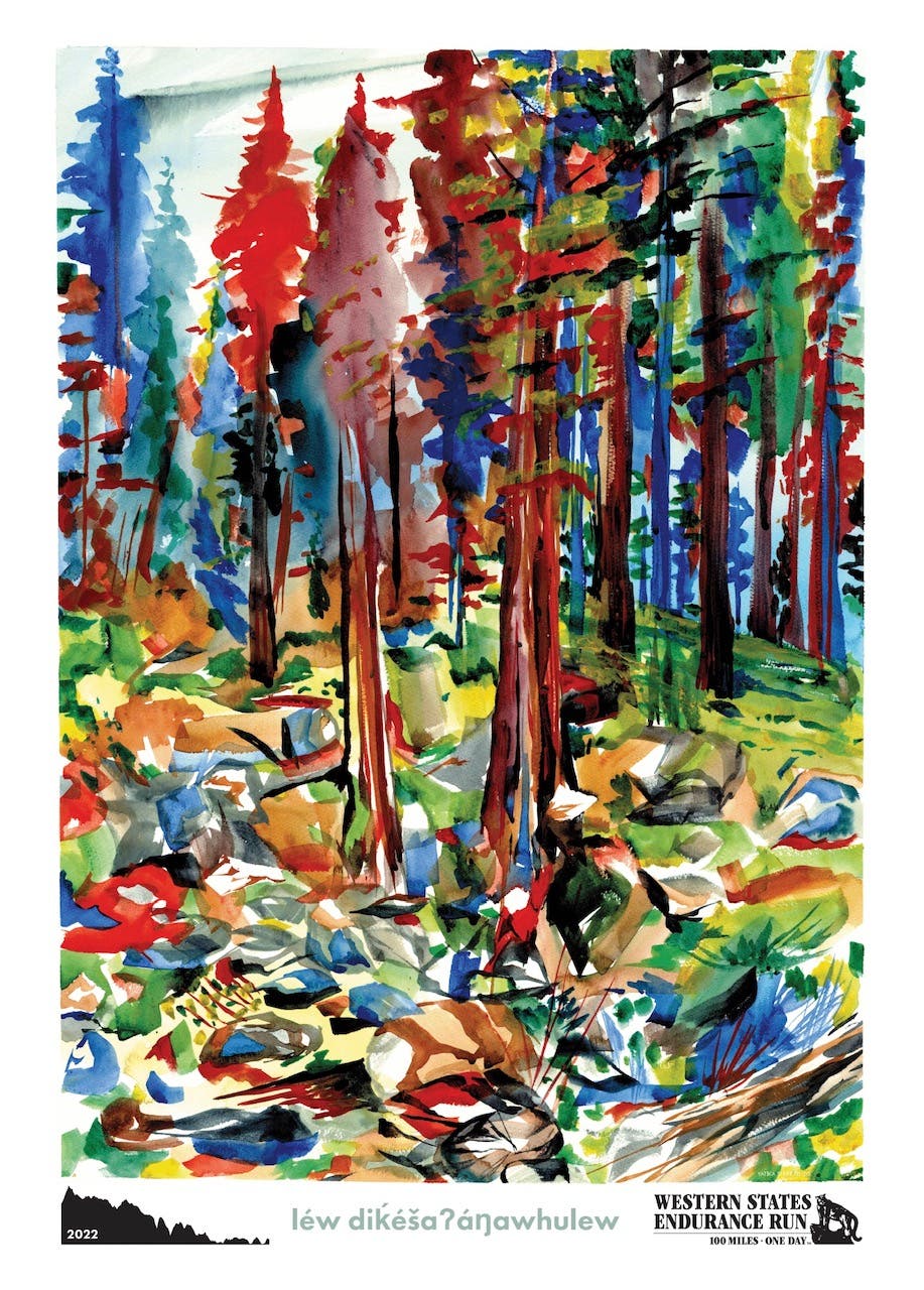 While attending the Western States training camp in late May, Fields covered about 70 miles of the course, but he also took time to paint four pieces of art to honor the Washoe, one of which became the first-ever official poster of the race. (The painting depicts a forest portrayed in brilliant colors with a Washoe phrase that translates to: “Together we will live-breath good.”) Proceeds of the sale of the posters will support the Washoe community and Western States Endurance Run Foundation.