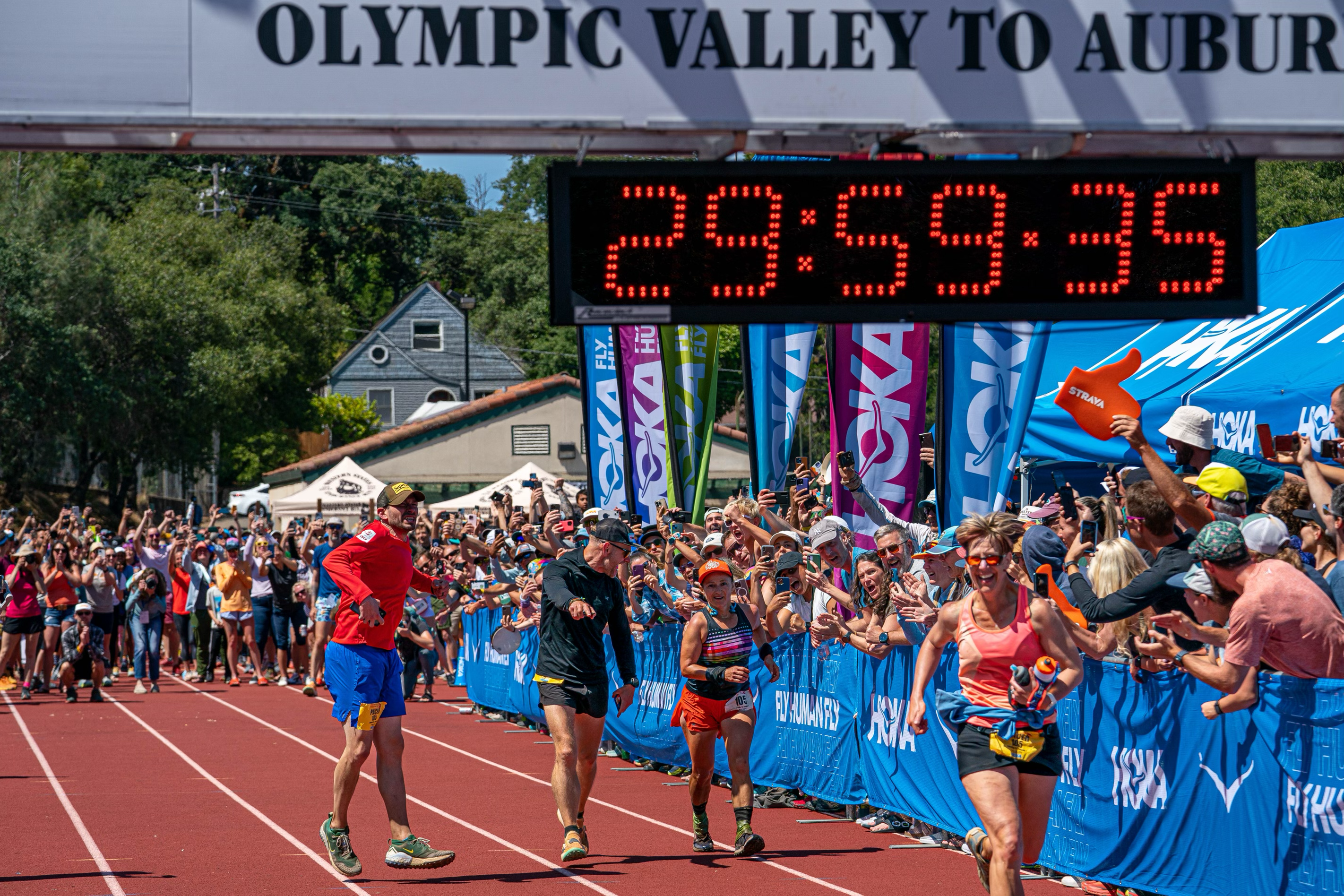 A few moments later, Brent Heady, 50, a first-time finisher from Irving, Texas, arrived at 29:55:5 with a Pride flag draped around his neck. As anticipation continued to grow, Mark Smith, 44, of Coon Rapids, Minnesota, trotted across the line with his pacers at 29:58:18 for his second Western States finish. Moments after Henrik Ostlund, 46, of Stockholm, Sweden, earned his first Western States finish in 29:58:55, Medinger announced that there was one minute remaining in the race.