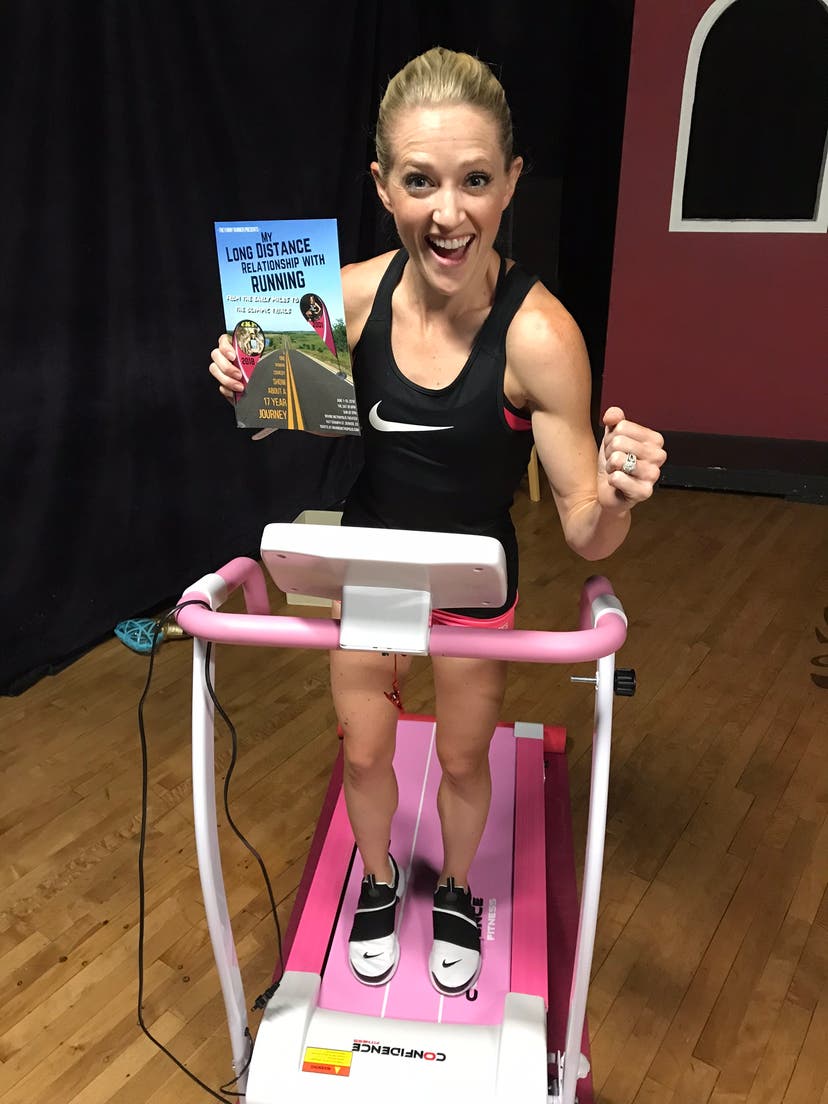 She created a one-woman show called “My Long-Distance Relationship with Running, from the Early Miles to the Olympic Trials.” Her show, which features running as a character personified by a pink treadmill that she runs on, traces her 17-year relationship with the sport, “from puppy love miles to eventually ‘going all the way’ in the marathon.” One scene features a cooking demonstration on “how to hate running.”