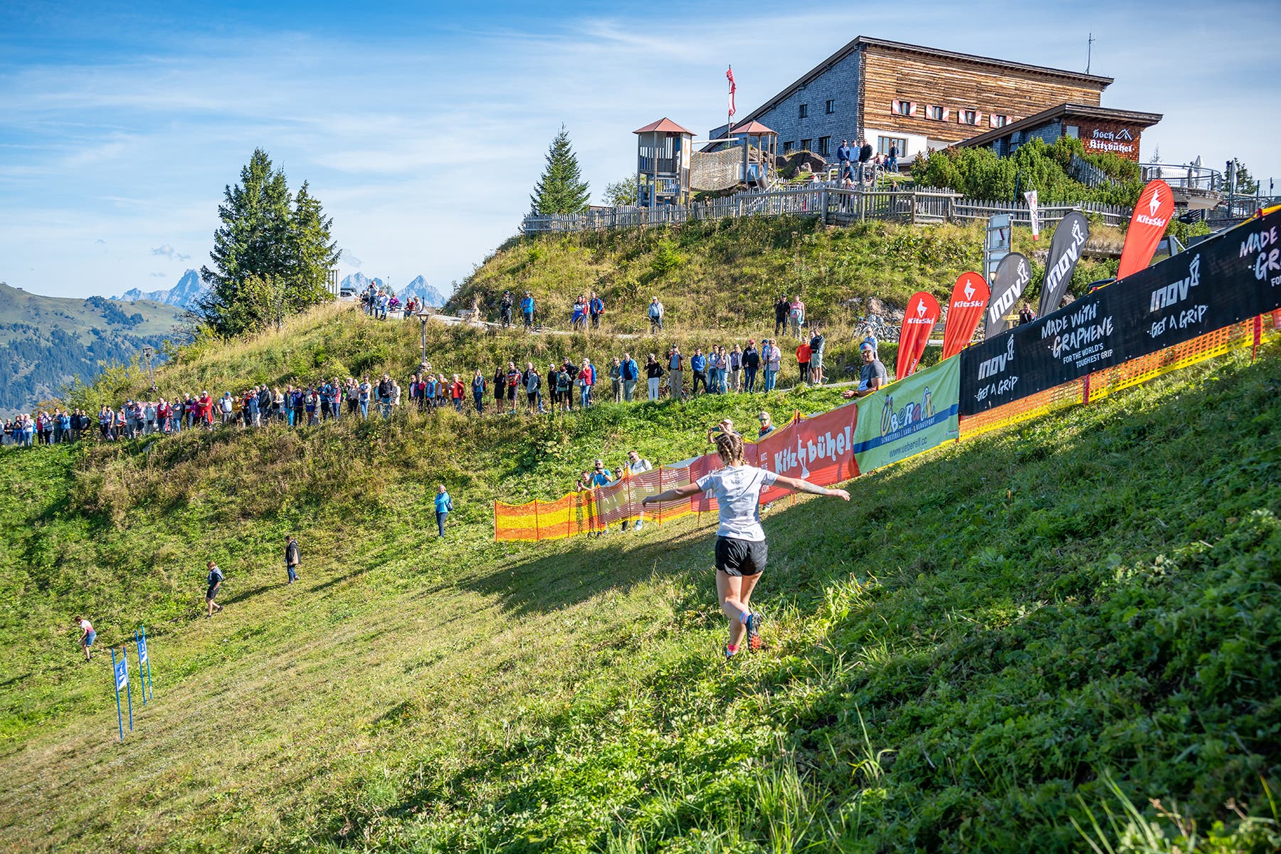 What makes the Inov-8 Descent Race+ so unique is that it’s held on the grassy slopes on the upper portion of the Streif, the ungodly steep course of the infamous Hahnenkamm Downhill ski race. As a ski race, it’s the most difficult on the World Cup tour, with grades as steep as 85 degrees and several double fall-line turns that making staying upright a huge challenge.