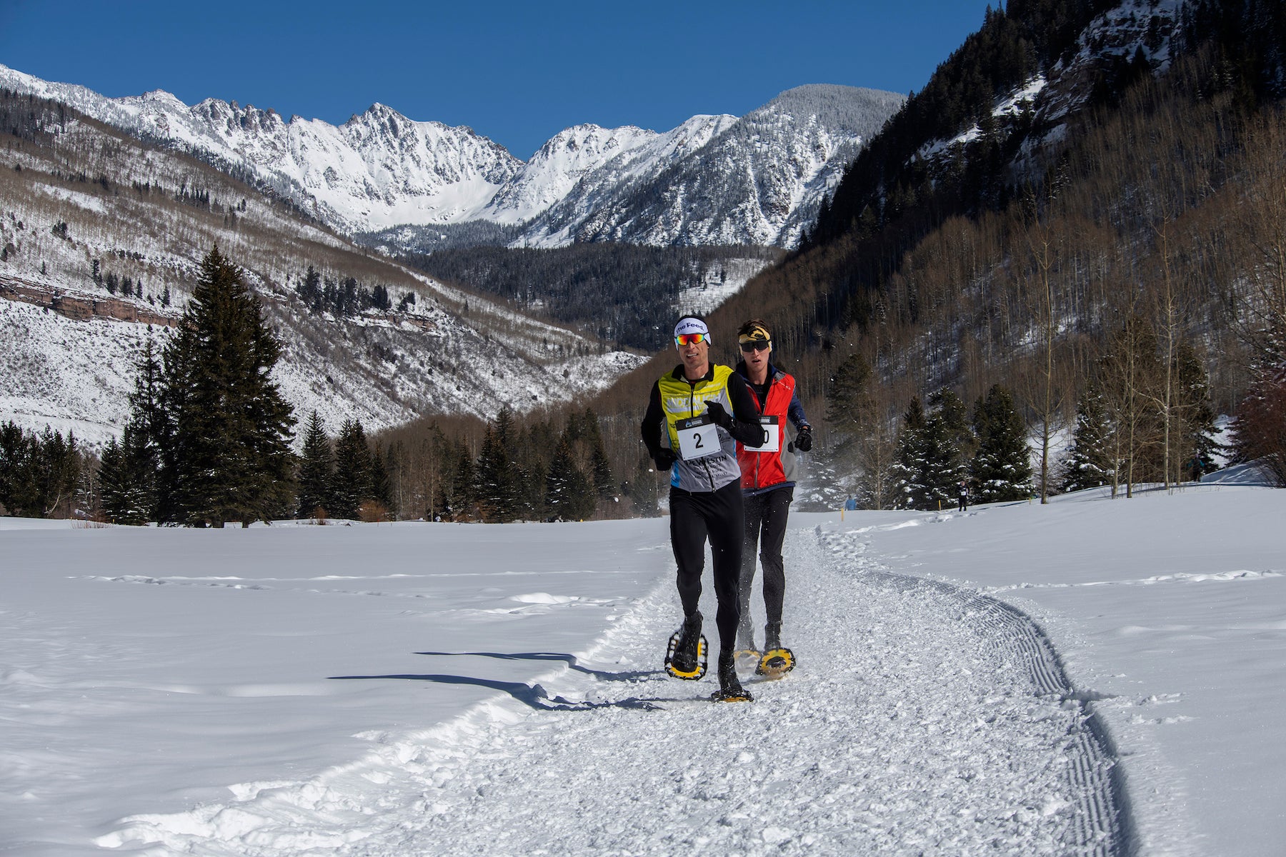 Most of the athletes were wearing running shoes strapped to lightweight, aluminum 8×25-inch snowshoes from Atlas, TSL, Redfeather, or OT Racing. I would have been, too, but one of my bindings broke while I was warming up and the makeshift repairs I made with duct tape and zip ties didn’t hold, so I had to rent a heavier pair from the Vail Nordic Center.