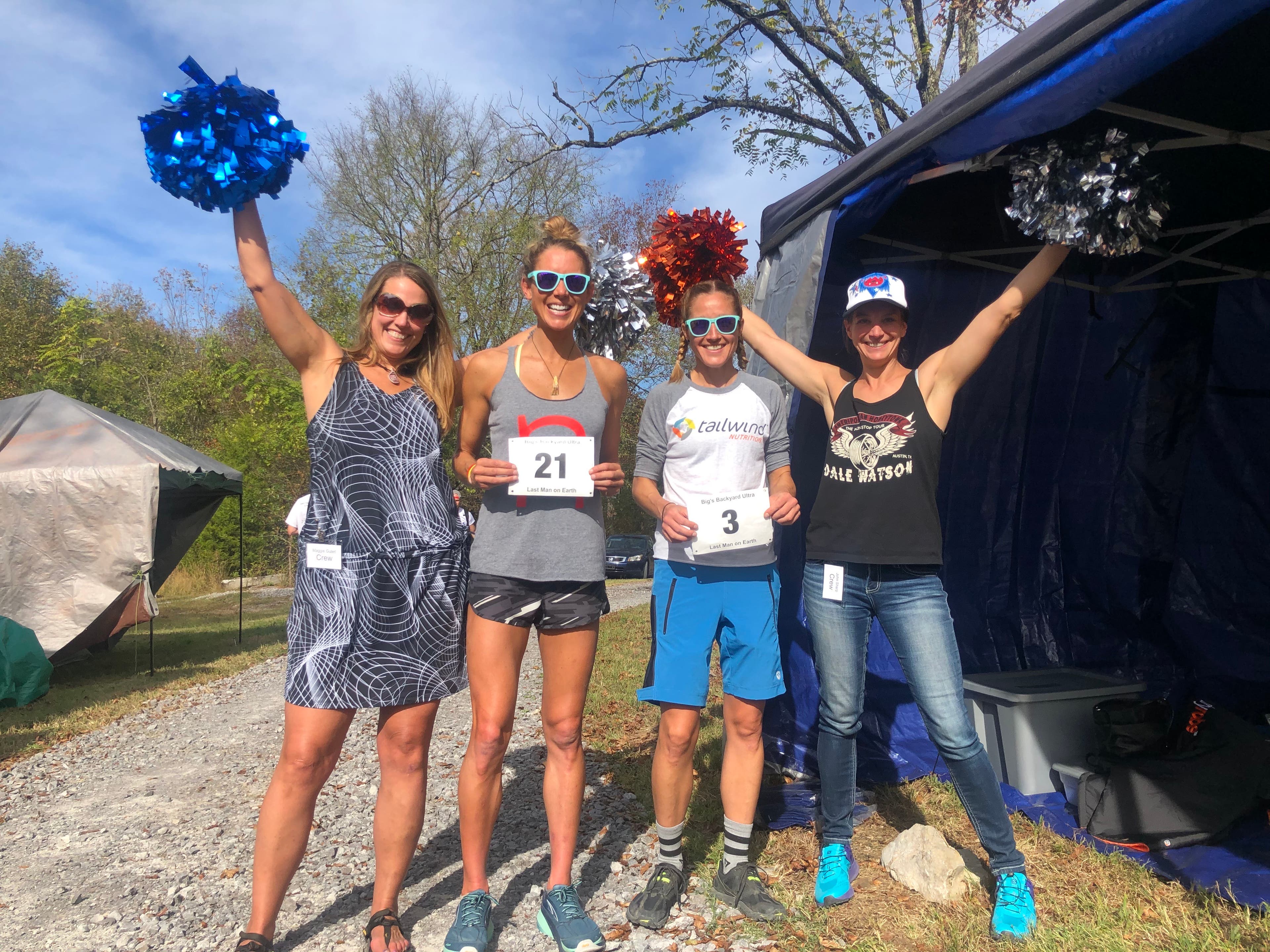 Her plan was to run the loop in 53 minutes, leaving her with seven minutes in the aid station to eat, stretch and regroup. She was crewed by the Jeer-leaders, a group of perky women named Gina and Jenn who, waving pom-poms, encourage competitors to quit with jeers like: