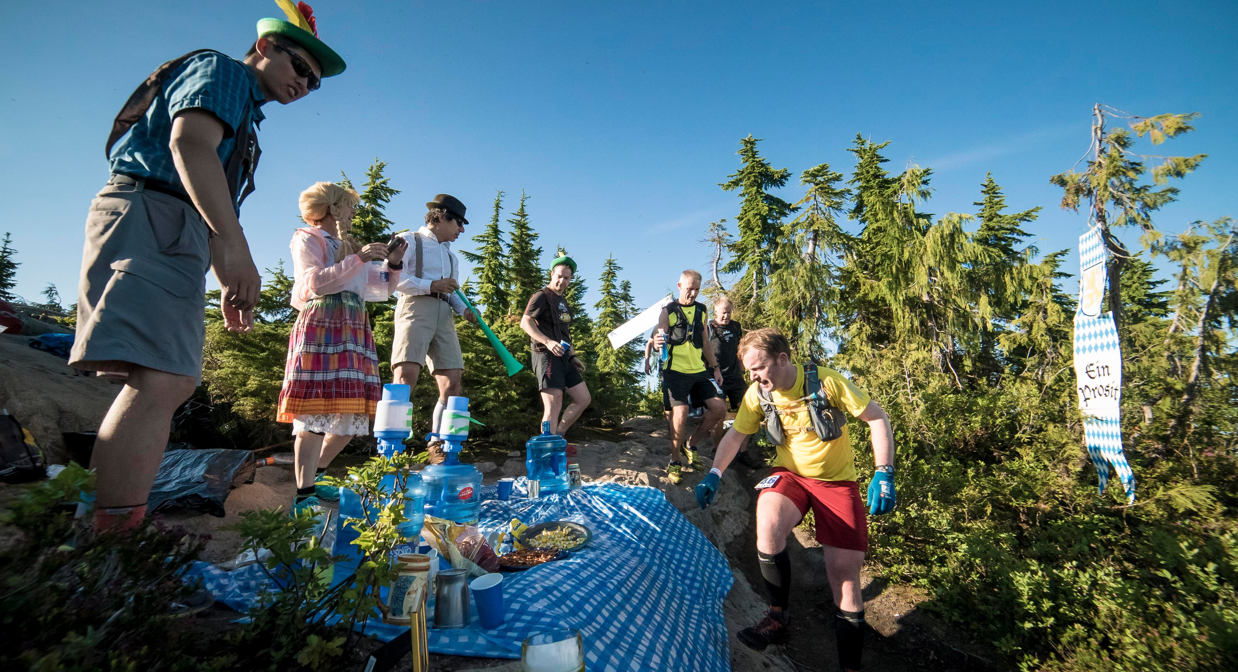 A couple of years ago the Black Mountain aid station entertained runners with a string quartet, with volunteers in white gloves serving water from plastic champagne glasses. Last year the aid station theme was Black Sabbath: all of the volunteers had Ozzy Osborne hair, while “Crazy Train” blared from a loudspeaker. This year’s biergarten theme had Black Mountain volunteers in traditional Bavarian outfits, serving water from beer steins.