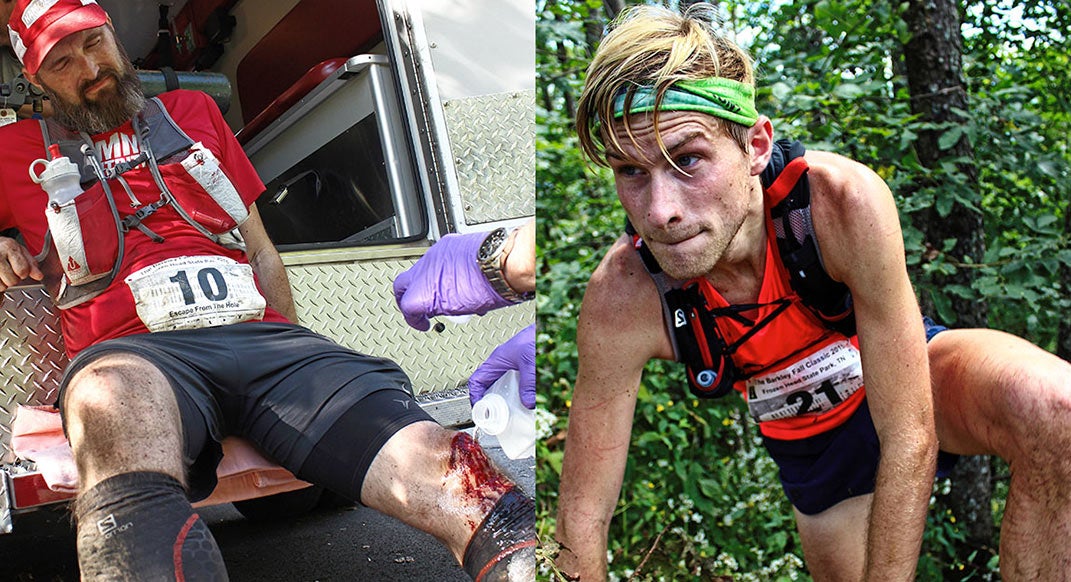 Runner Josh Berry took a fall on the way down Rat Jaw. The rocky footing cut his knee down to the bone. Berry walked four miles down Rat Jaw to the next checkpoint, at 22 miles, skin flapping open with each step. Laz, one of the Barkley race directors, informed him that “there’s no Boston Qualifier at stake, no PR to shoot for. We can have somebody drive you back [to the finish] so you can get stitches.” Berry politely declined the offer for a ride, instead, picking up a hiking stick and walking himself to the paramedics, and from there to a “marathon” finish.