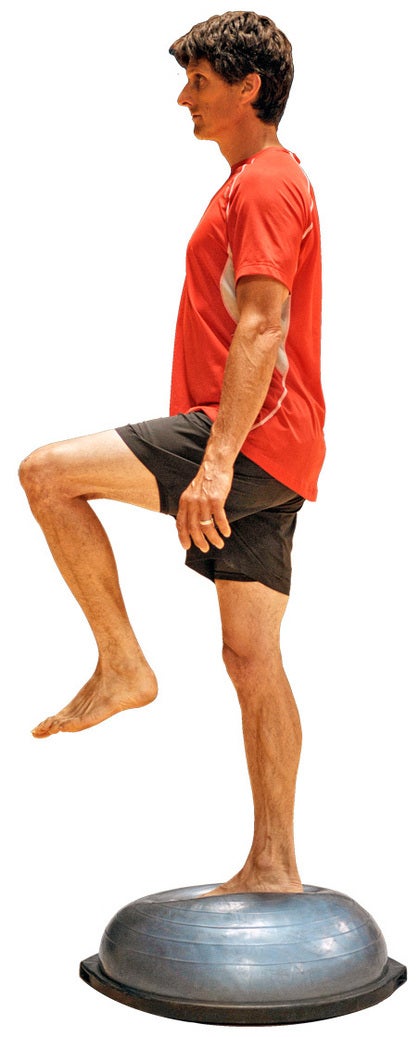 Start by standing on one leg on ball side of the BOSU, with standing leg quad engaged and raised leg extended as close to 90-degrees as your flexibility allows. Bend your standing knee 30 to 45 degrees and then return to standing. As you squat, sit back slightly, like sitting in a chair, to engage your glutes. Perform two to three sets of 15 reps on each side.