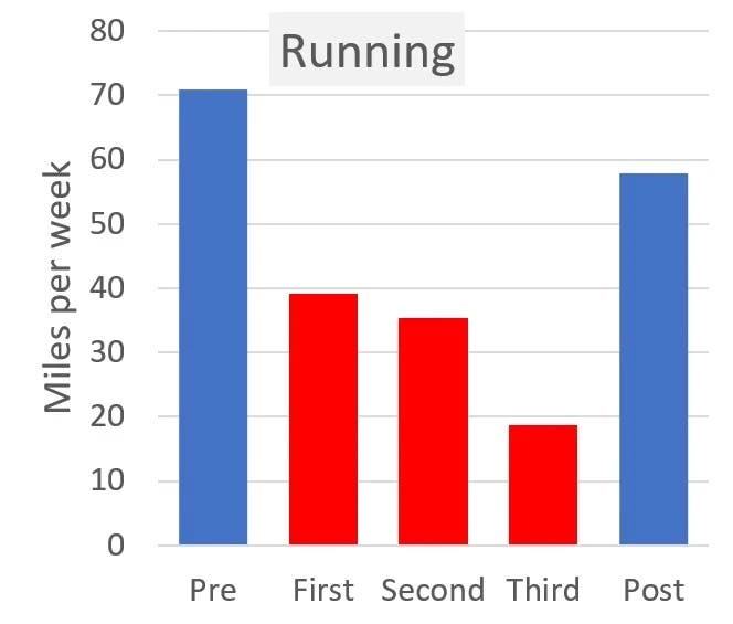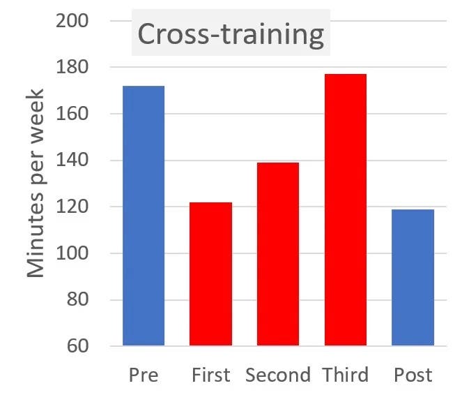 In parallel, they ramped up cross-training, presumably to lower-impact activities like elliptical or swimming, so that total training time remained similar. Here’s how that evolved: