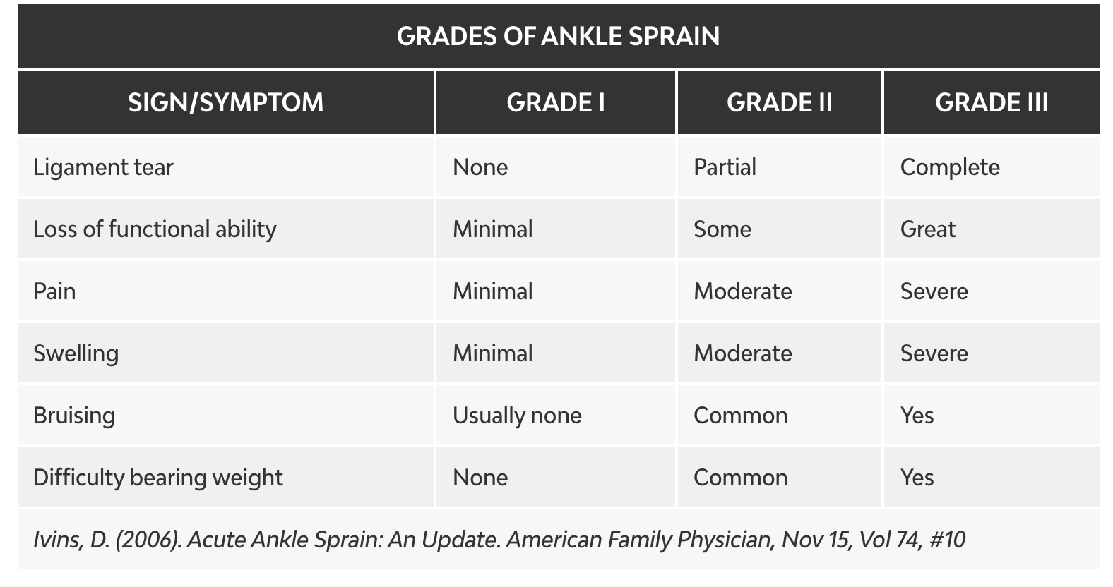 Grade III sprains are most severe and require examination from a professional to rule out the need for surgical repair or the presence of a fracture. Grade II and III sprains will benefit from physical/physio therapy to aid recovery. Non-steroidal anti-inflammatories may be beneficial for pain relief and to speed up recovery. Grade I sprains normally don’t require any change in activity, but you should be cautious to ensure you avoid a subsequent ankle sprain, which could be more severe.Rehabbing an ankle sprain is important to reduce the risk of future ankle sprains and the development of chronic ankle instability. A reduction in optimal ankle joint range of motion and poor proprioception (sense of balance) can result, leading to a host of other overuse injuries in different joints and bones in the body. For example, ankle mobility issues can lead to inefficiencies in the running gait and contribute to the development of shin splints or knee issues.