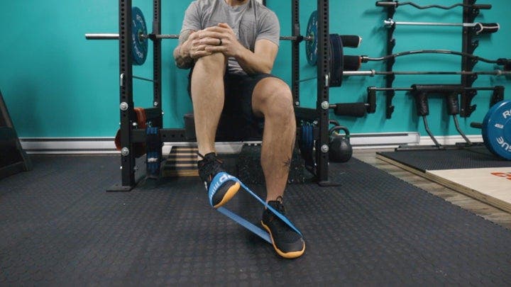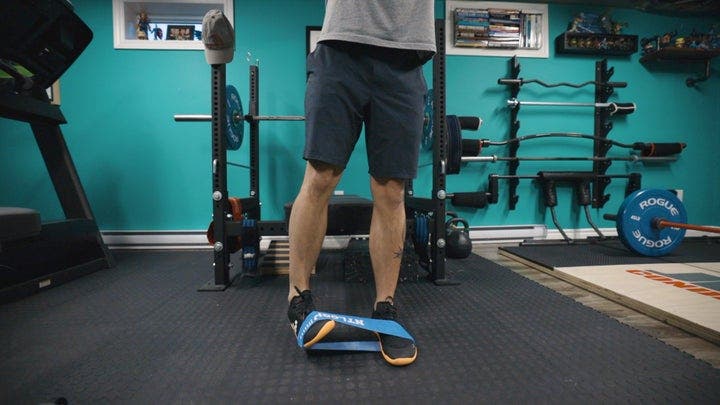 Place a band around the outside of your foot and anchor the other end. Draw circles with your big toe with the resistance challenging the outward motion of the ankle. Do 3–4 sets of 20–30 reps daily for 3–4 weeks.