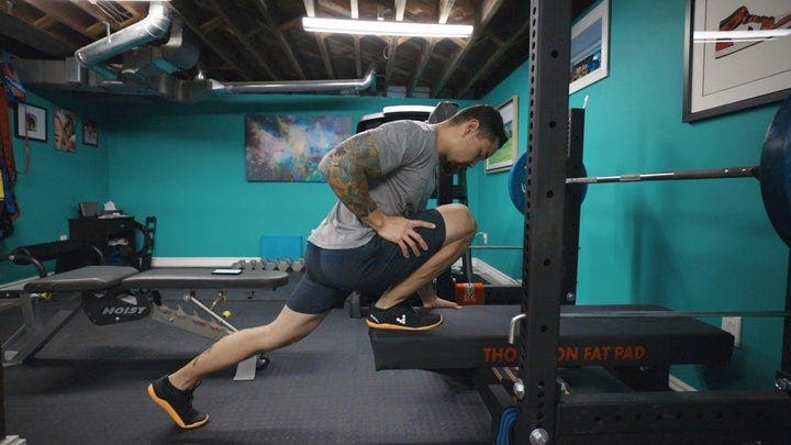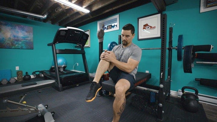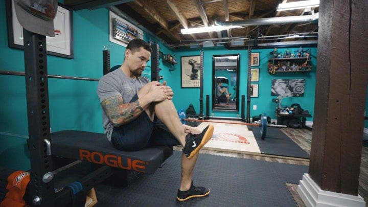 Place your foot on a kitchen chair or exercise bench and bring your hips toward your ankle. Bring your knee past your toes and use the weight of your body to push your knee beyond your toes at a point where your heel just wants to lift off the ground. Gently bounce back and forth to promote a loosening of your ankle joint. When bouncing, ensure your knee tracks over your 3rd, 4th and 5th toes.