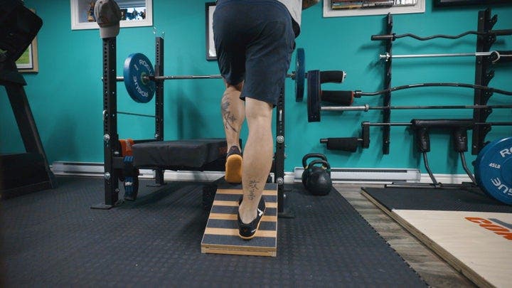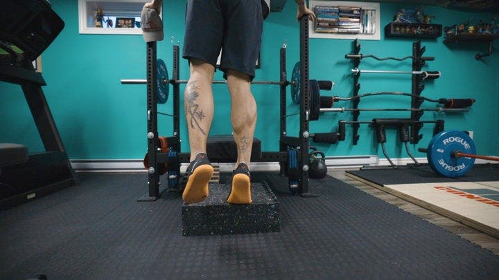 Stand on your affected side on a step and go up onto the balls of your feet. Lower your heel below the surface of the step. Perform 3–4 sets of 8–12 reps every other day for 3–4 weeks.