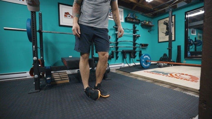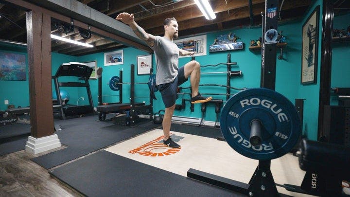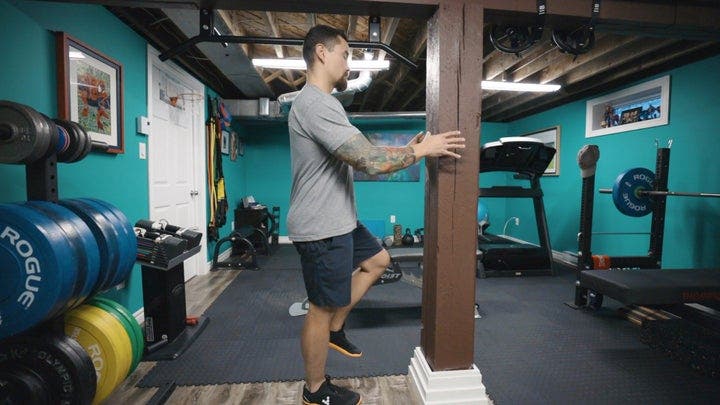 First, stand barefoot on the affected side and slightly bend your knee. Bow forward and reach your opposite leg back. Hold your arms straight out to the side and continue bowing until your torso is parallel to the floor. I call this position the airplane – some call it a single-leg deadlift. Next, return to standing and bring your knee toward your torso. If you’ve seen the Karate Kid, you’ll know this as the Crane Kick. Keep your arms out at your sides and stand tall. Pull your toes up toward your shin. Perform up to 12–15 reps in a row. Do every other day for 3–4 weeks.