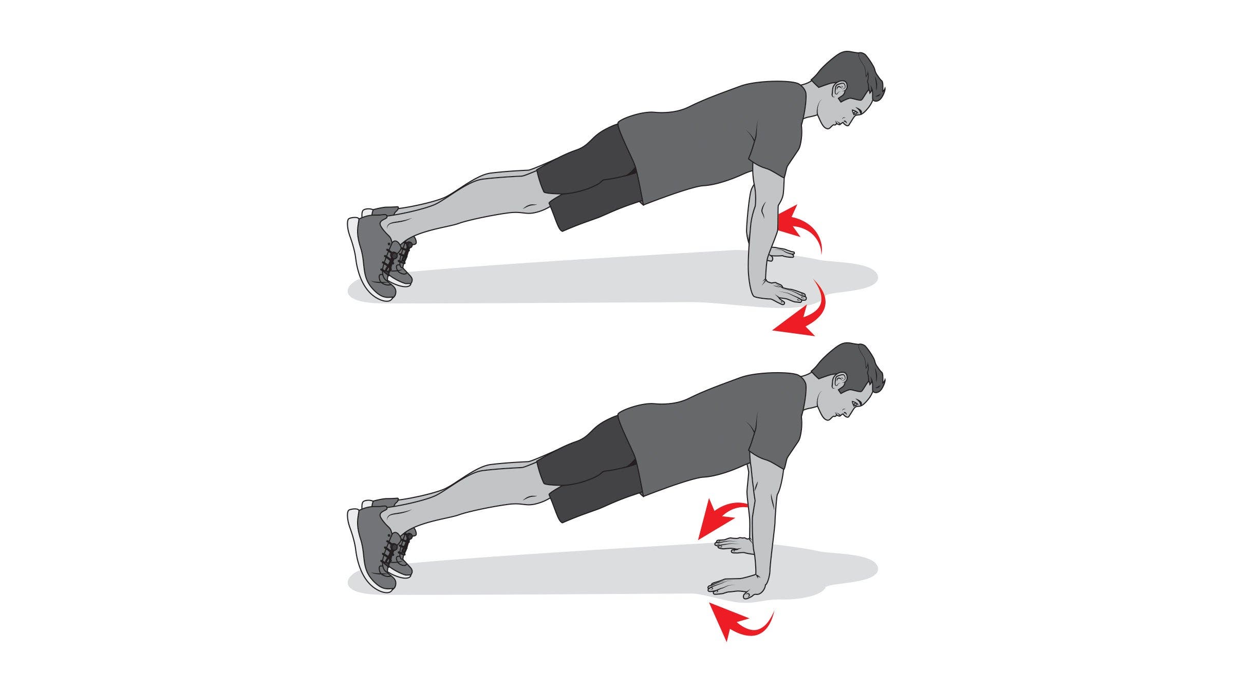 Start in a plank from your hands. While keeping your elbows locked out, allow your chest to sink through your shoulder blades and closer to the floor. Then, while keeping your elbows locked out, press your chest away from the floor to create as much distance as possible. By screwing your hands into the floor, you add some external rotation into the shoulder which is key for good posture and scapular engagement. Alternate between these two positions slowly and with control and as much exaggeration as you can on either end. Repeat five to 10 times.