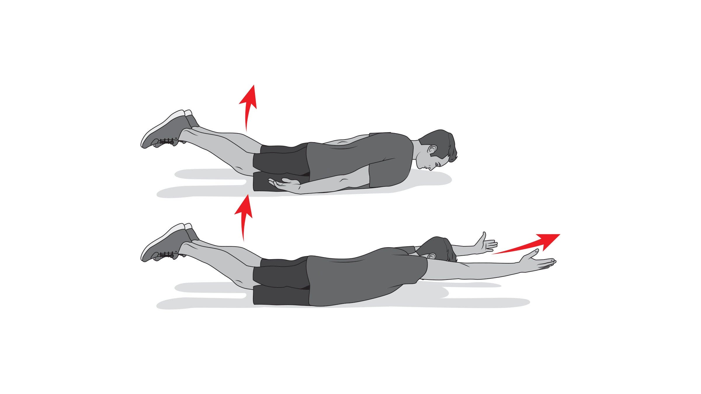 Begin lying face down. While squeezing your abs for stability, actively squeeze your butt and press your hips into the ground. You should feel increased pressure on the ground if this is done correctly. From here—and while still squeezing your butt aggressively—actively pull your thighs off the ground about 1⁄4-inch. Point your toes and flex your quads for additional tension and stability. From here, and while keeping your hands palm up by your hips, pull your chest and shoulders a 1⁄4-inch off the ground, and hold.