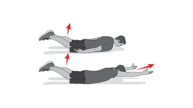 - Begin lying face down. While squeezing your abs for stability, actively squeeze your butt and press your hips into the ground. You should feel increased pressure on the ground if this is done correctly. From here—and while still squeezing your butt aggressively—actively pull your thighs off the ground about 1⁄4-inch. Point your toes and flex your quads for additional tension and stability. From here, and while keeping your hands palm up by your hips, pull your chest and shoulders a 1⁄4-inch off the ground, and hold.