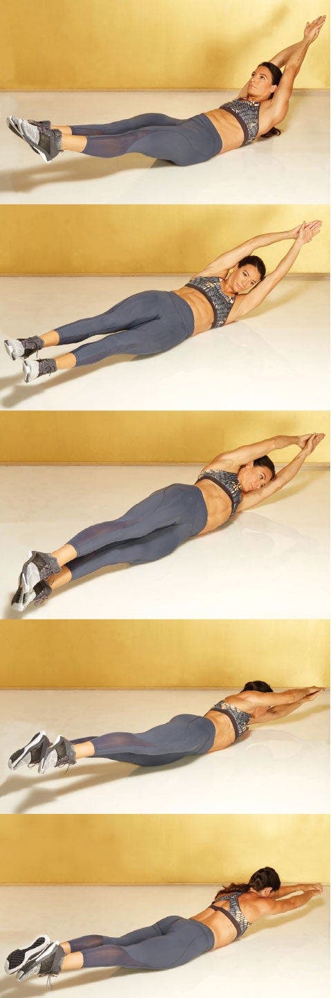 Lie faceup with your arms and legs extended. Press your lower back into the floor and brace your core, then lift your head, shoulders and legs off the floor several inches so your body makes a shallow crescent shape. Hold here for time.