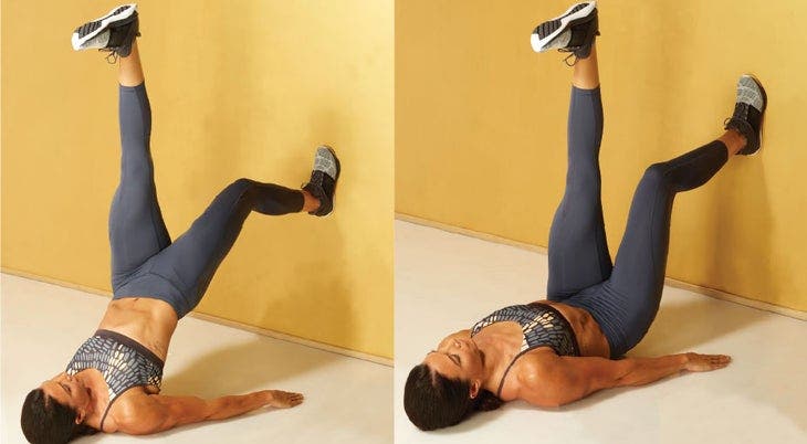 Start: Lie faceup and place your feet flat on a wall about hip-width apart with your knees and hips bent at 90-degree angles and your arms extended along your sides.