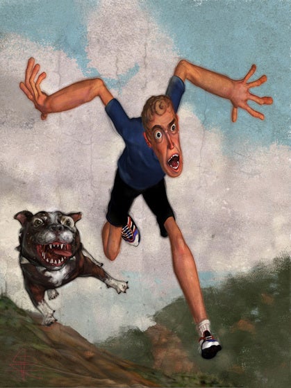 Suddenly bursting through a thicket, some 15 feet to our right, was a black-and-white spotted dog, baring its teeth, and another wild-eyed companion behind it. They lunged toward us, snarling and barking. We had nothing but our water bottles to defend ourselves. We shouted at the dogs, which brought the owner out of a dilapidated trailer to retrieve them, and we were able to back away and move on down the trail. This is a scenario all too familiar for runners.