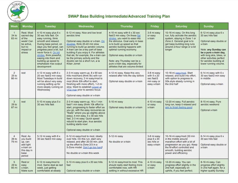 The lower range starts at 24 miles per week and peaks at 34, with plenty of cross training options, while the high end gets up to 100 miles and is usually around 80-90. Weeks 1-3 build up volume and VO2 output. Weeks 4 and 5 focus on the addition of steady running. Weeks 6 to 12 increase the aerobic training stress while improving output around aerobic threshold. You can start in week 6 if you are rolling into base-building with good fitness, or confine the plan to the first 6 weeks if you have a compressed time window for training after an offseason.