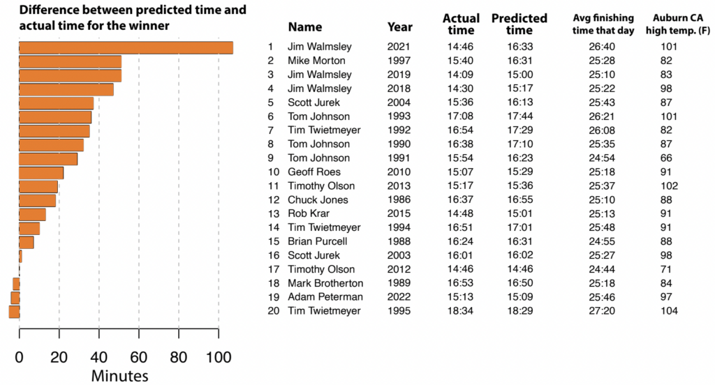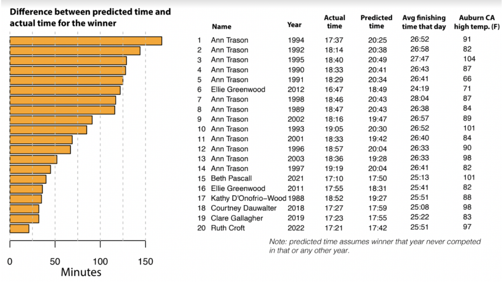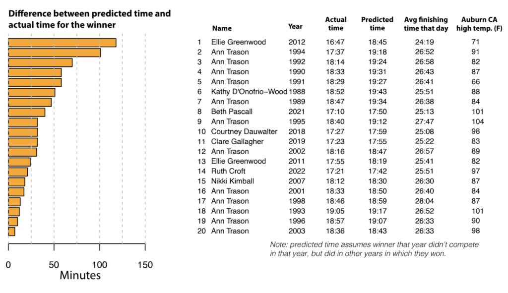 Now we have the context to think about the immortal Ann Trason. She won Western States 14 times, in bonkers performances that put her in the overall top-6 8 times. Let’s start with the model that predicts winning times assuming that the year’s winner never existed, since Marshall thinks it’s the fairest to outliers. We included the average finishing time and high temperature in Auburn for context. Prepare to have your mind blown.