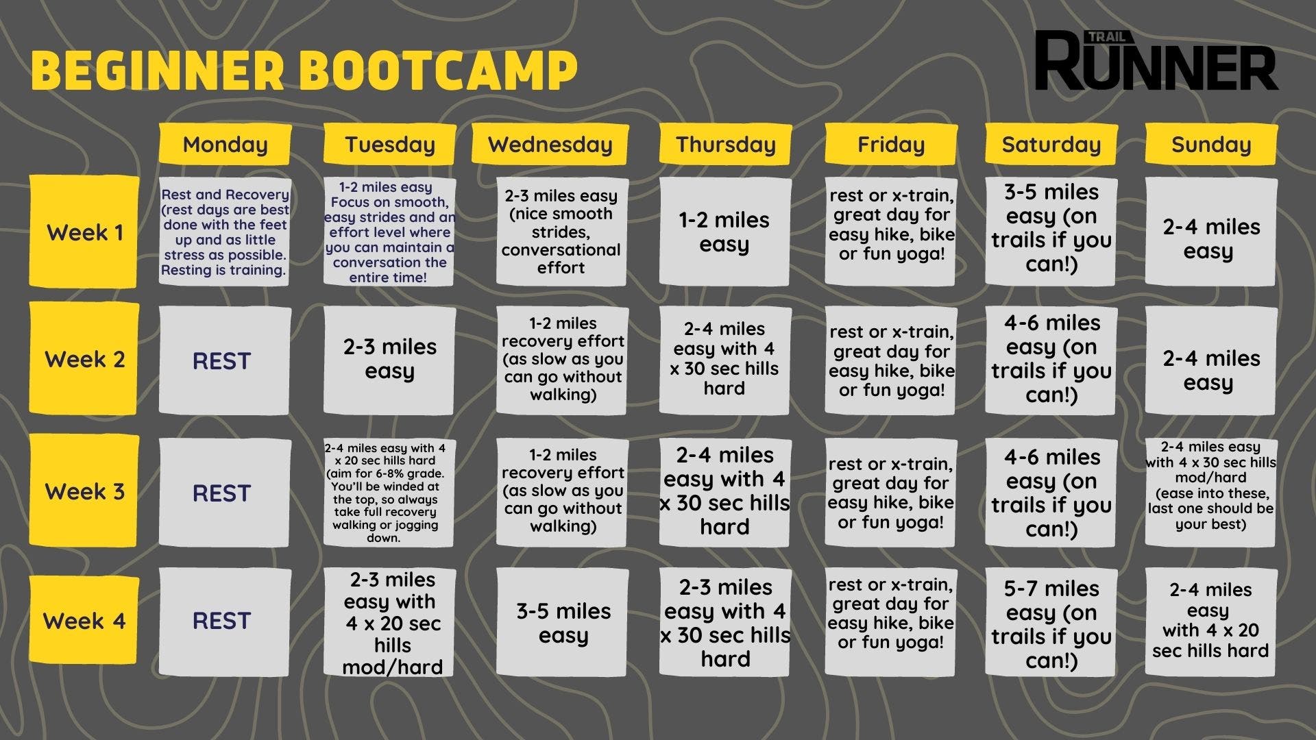 This Beginner Bootcamp is designed for someone who’s looking to bring a bit more consistency and intention to their training. If you’re able to run a few miles at a time, a couple of times a week, this plan will help you optimize your training and take you to the next level in your trail running, whether you’re looking to jump into trail races or just run more consistently and healthfully.