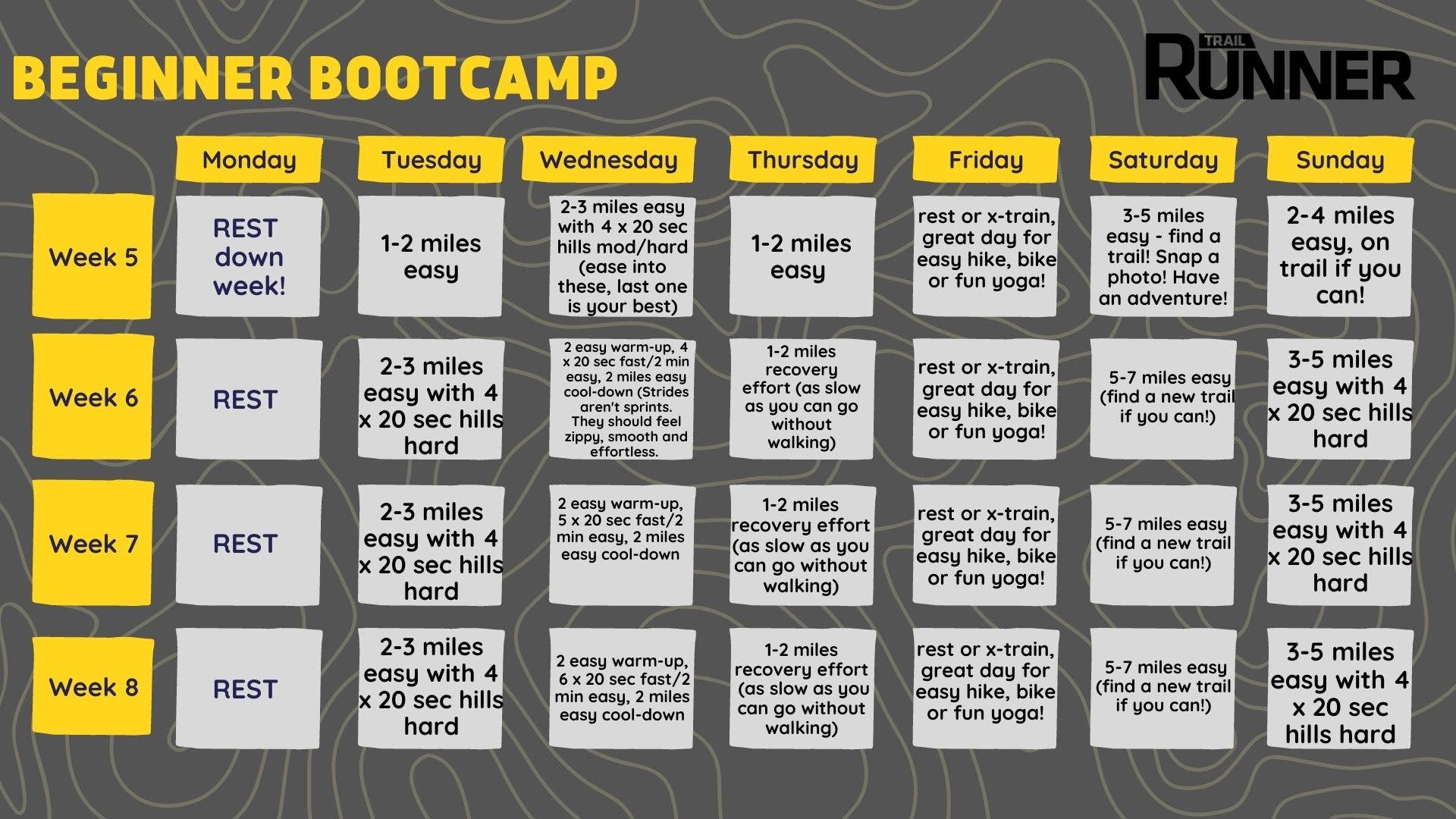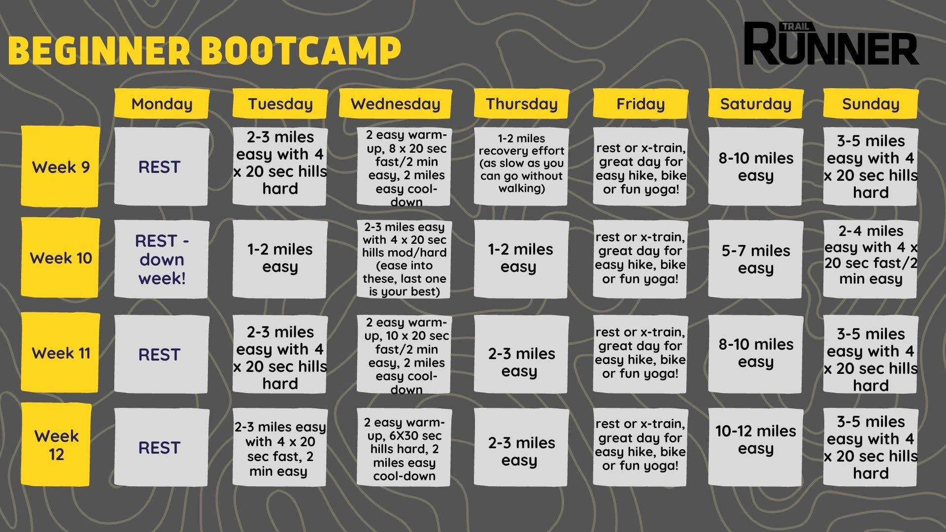 After 12 weeks of this Bootcamp, you’ll have a pretty solid base to consider taking on a bigger challenge, like increased mileage or even a trail race!