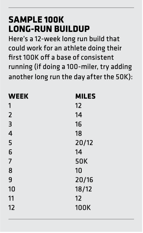 In a perfect world, a 50-miler (or even 100k) in the six to 12 weeks before is optimum, since there seem to be some adaptations that require venturing into that unknown territory, particularly for the metabolic and neuromuscular systems. The remainder of the long runs can look like 50-miler training above, but with less of a need for the 50k training race. If no 50-miler, doing a 50k with a long run of 12-20 miles the next day can simulate similar stress.