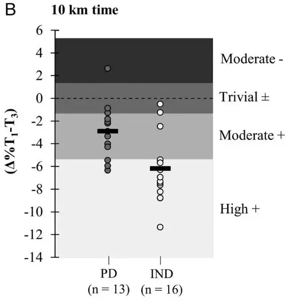 There are lots of moving parts in a study like this, but if we scan down to the bottom line, we see this: the pre-planned group improved their 10K times by 2.9 percent, on average, which is about what you’d expect. The algorithm group improved their average times by 6.2 percent, which is very impressive. Here’s what the individual improvements look like for the predetermined (PD) and individualized (IND) groups, with negative numbers representing a greater percentage improvement:
