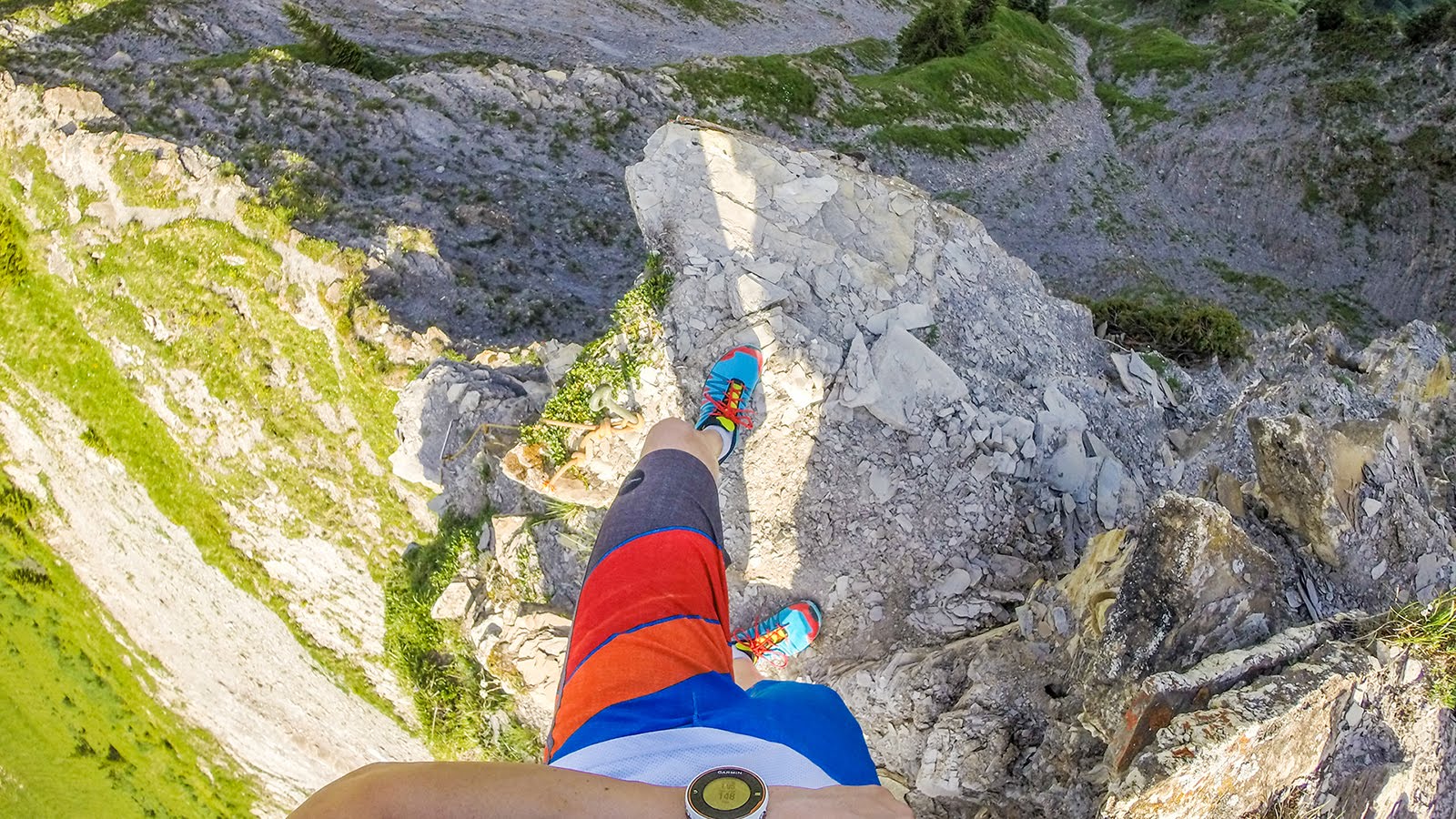 In this video, filmed on a high ridge on Niesen, Stefan Wyssen picks his way across a narrow strip of rock and grass that separates two multi-thousand-foot drops.